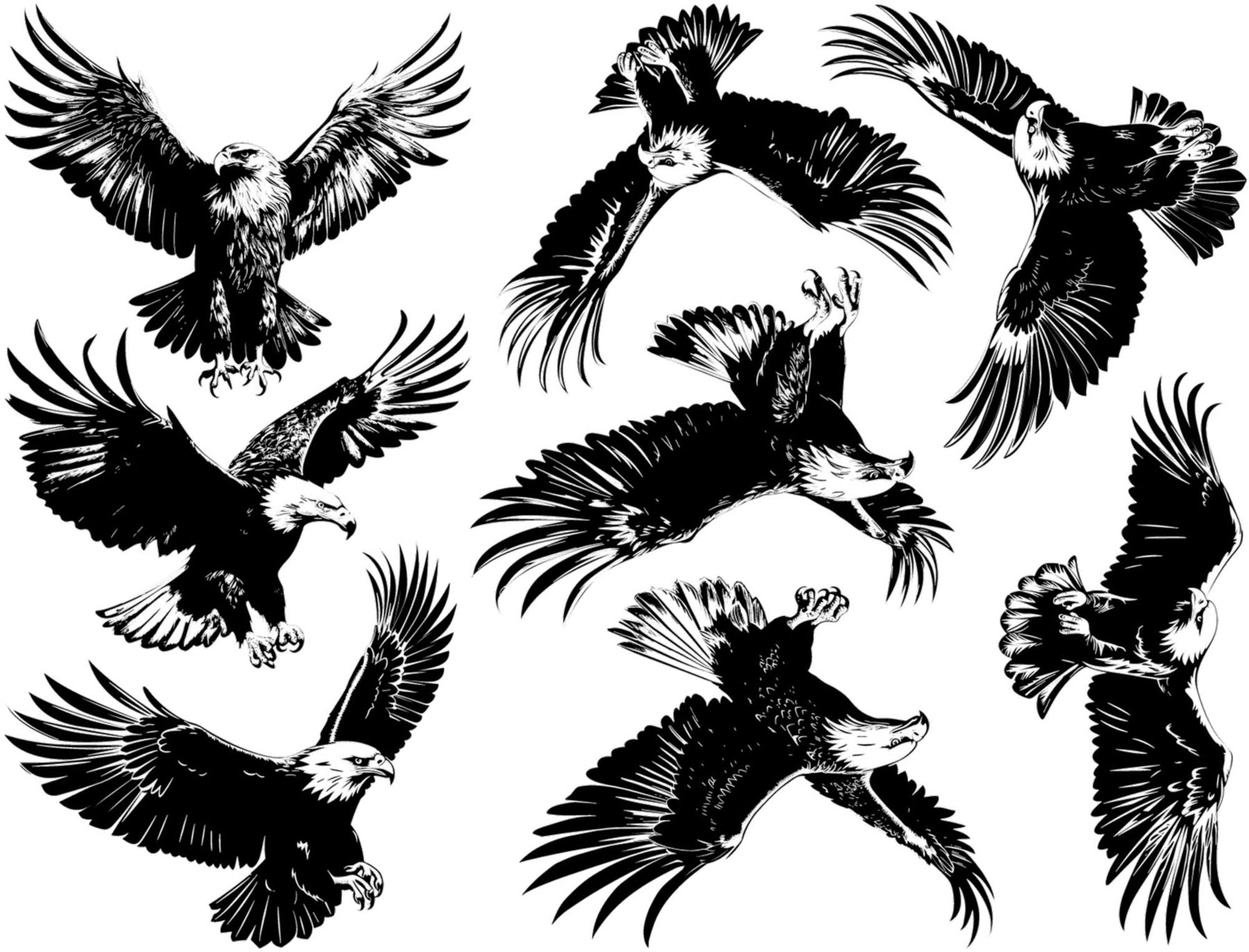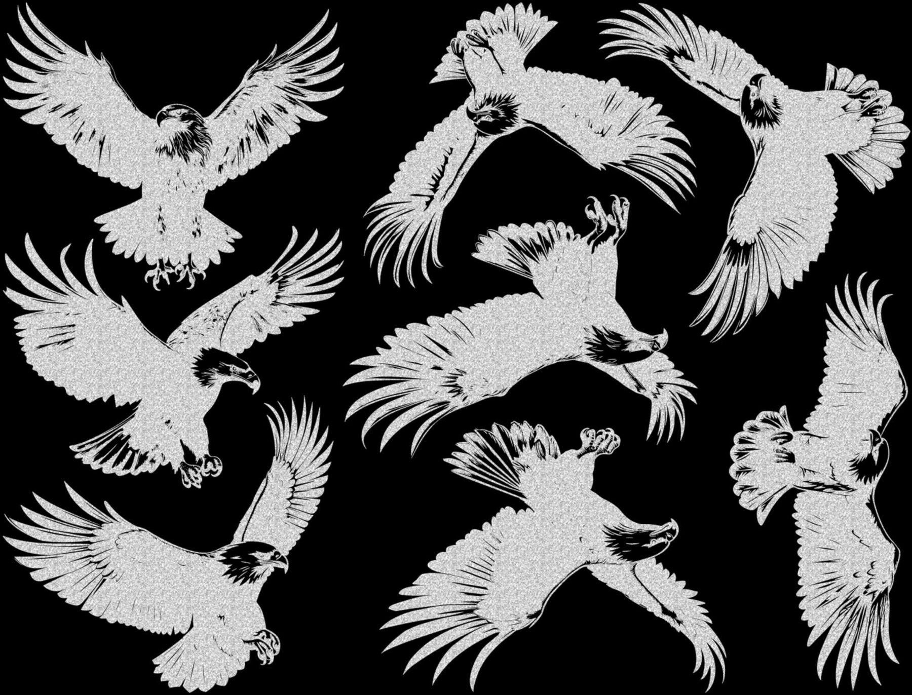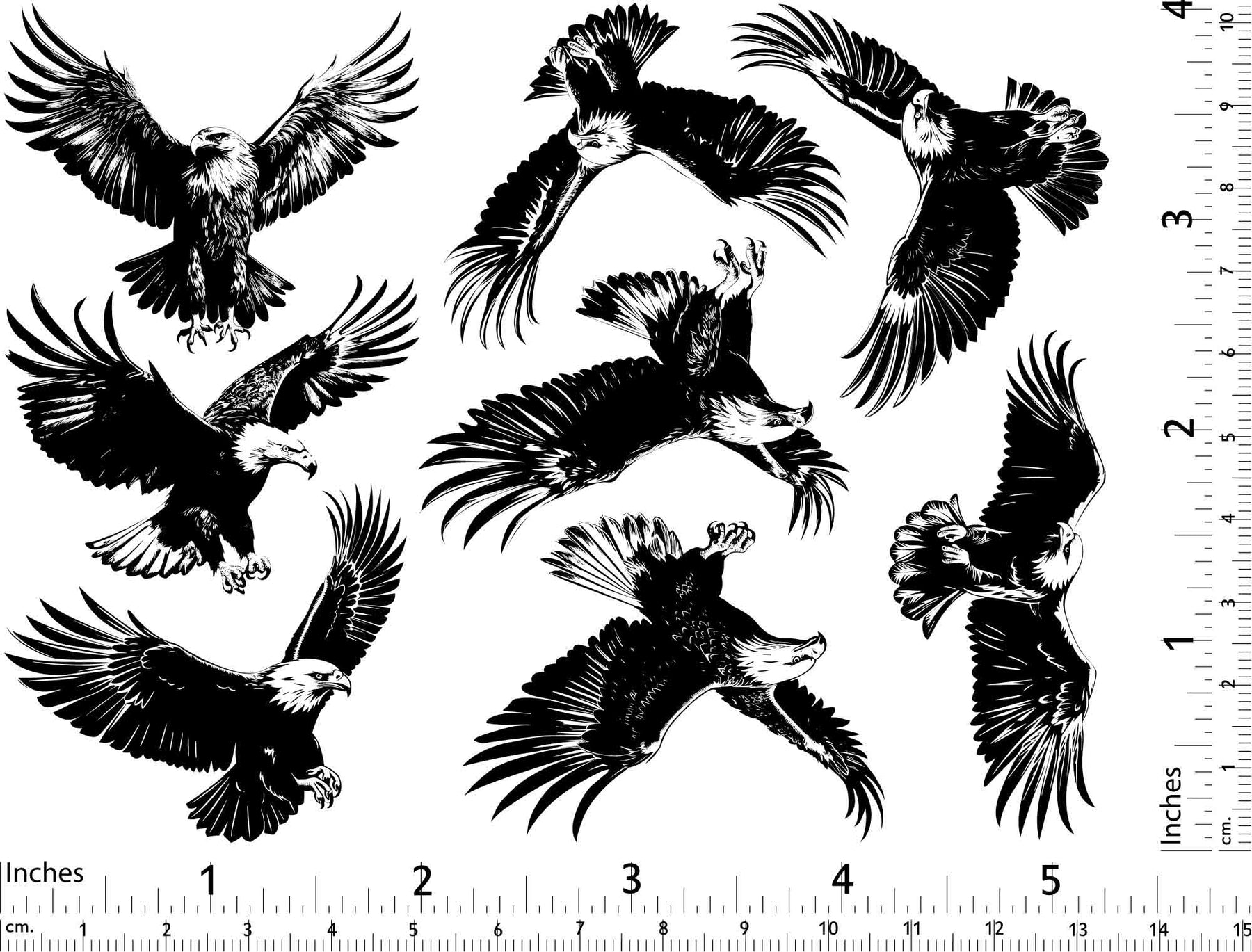 Total number of decals:  8 eagle illustrations.  7 of the eagles are 2 in (5 cm) at their widest dimensions and one is 2.5 in (6,35 cm) wide